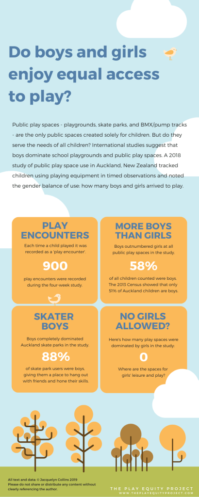 From a spatial perspective we reinforce territorialisation when we continue to build leisure facilities that are only used by boys. What message does this send to girls? Public money is spent on spaces in which they don’t feel welcome – spaces where they may be actively dissuaded from enjoying themselves. At present we don’t make any effort to provide equivalent spaces for girls, which is a point that Sargisson and McLean also make in their 2013 study of New Zealand playgrounds.